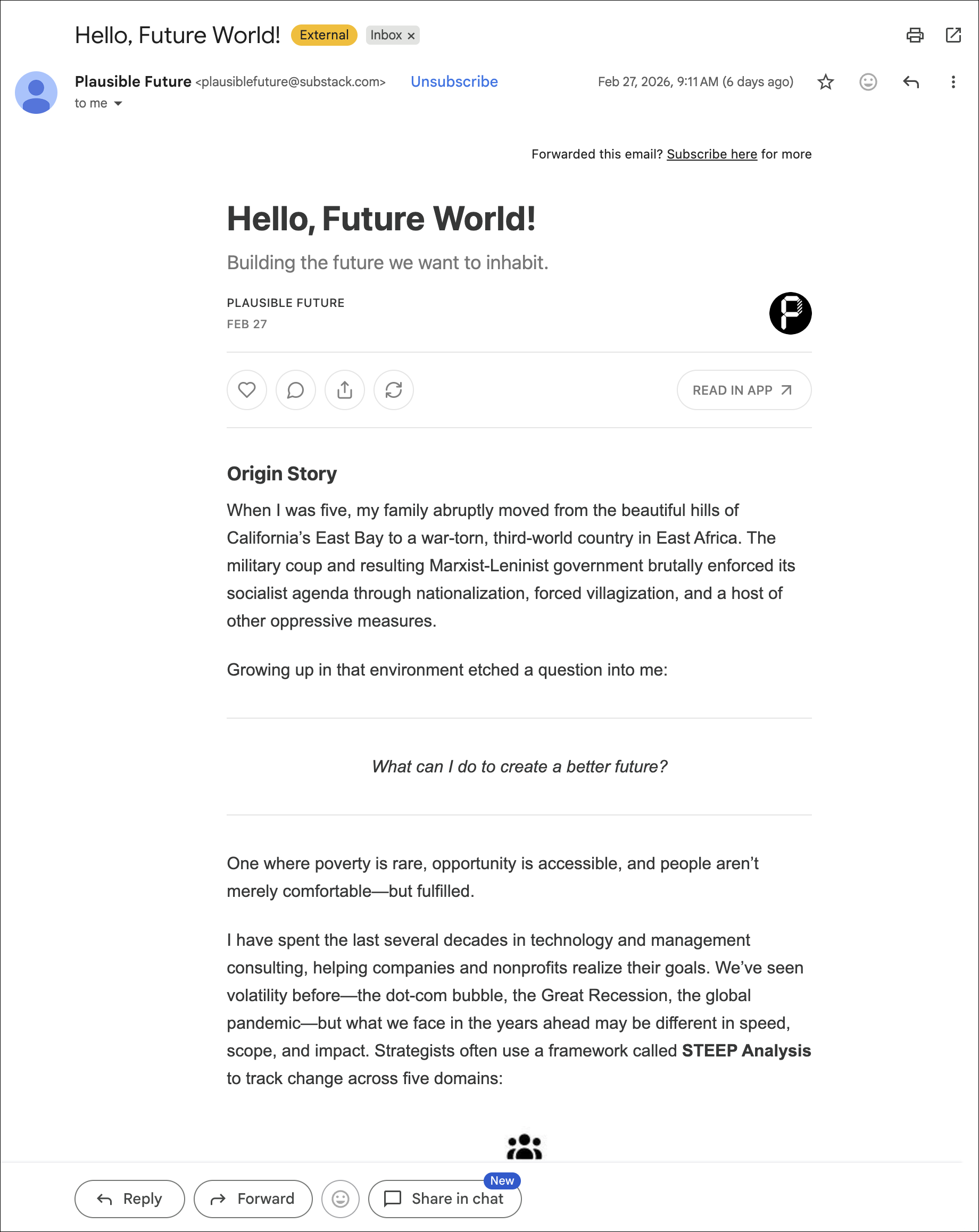 The Plausible Future newsletter distills emerging shifts into structured, actionable insight. Each issue explores technological acceleration, institutional change, and second-order effects — with a focus on what you should be paying attention to now.